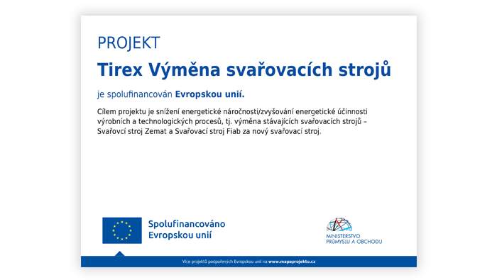 Cílem projektu je snížení energetické náročnosti a zvýšení energetické účinnosti výrobních a technologických procesů společnosti TIREX AUTOPLACHTY s.r.o. V rámci projektu dochází k výměně zastaralých svařovacích strojů Zemat a Fiab za nový moderní svařovací stroj s výrazně nižší spotřebou energie.